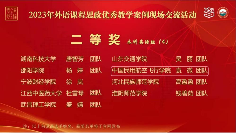 由国际合作部袁微副教授和taptap点点足彩叶家春副教授、黄思杰老师组成的团队以此项赛事四川省英语专业组特等奖身份入围全国交流活动。此次活动赛制为随机抽取文本材料,参赛教师经过90分钟的现场准备,基于指定素材对课程思政教学设计进行说课展示,然后回答评委提问。现场赛制对于教师的教学基本功、临场应变能力和文本思政元素提炼能力都是极大的挑战。经过激烈角逐,团队最终斩获全国二等奖。