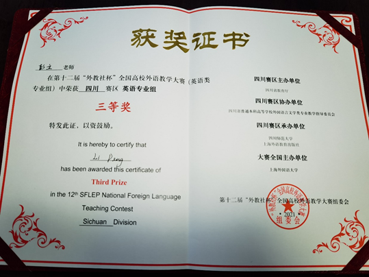 6月11日-13日,第十二届“外教社杯”全国高校外语教学大赛(英语类专业组)四川赛区比赛在四川师范大学圆满落幕。我校taptap点点足彩民航英语教研室教师彭立斩获本次大赛英语专业组三等奖。