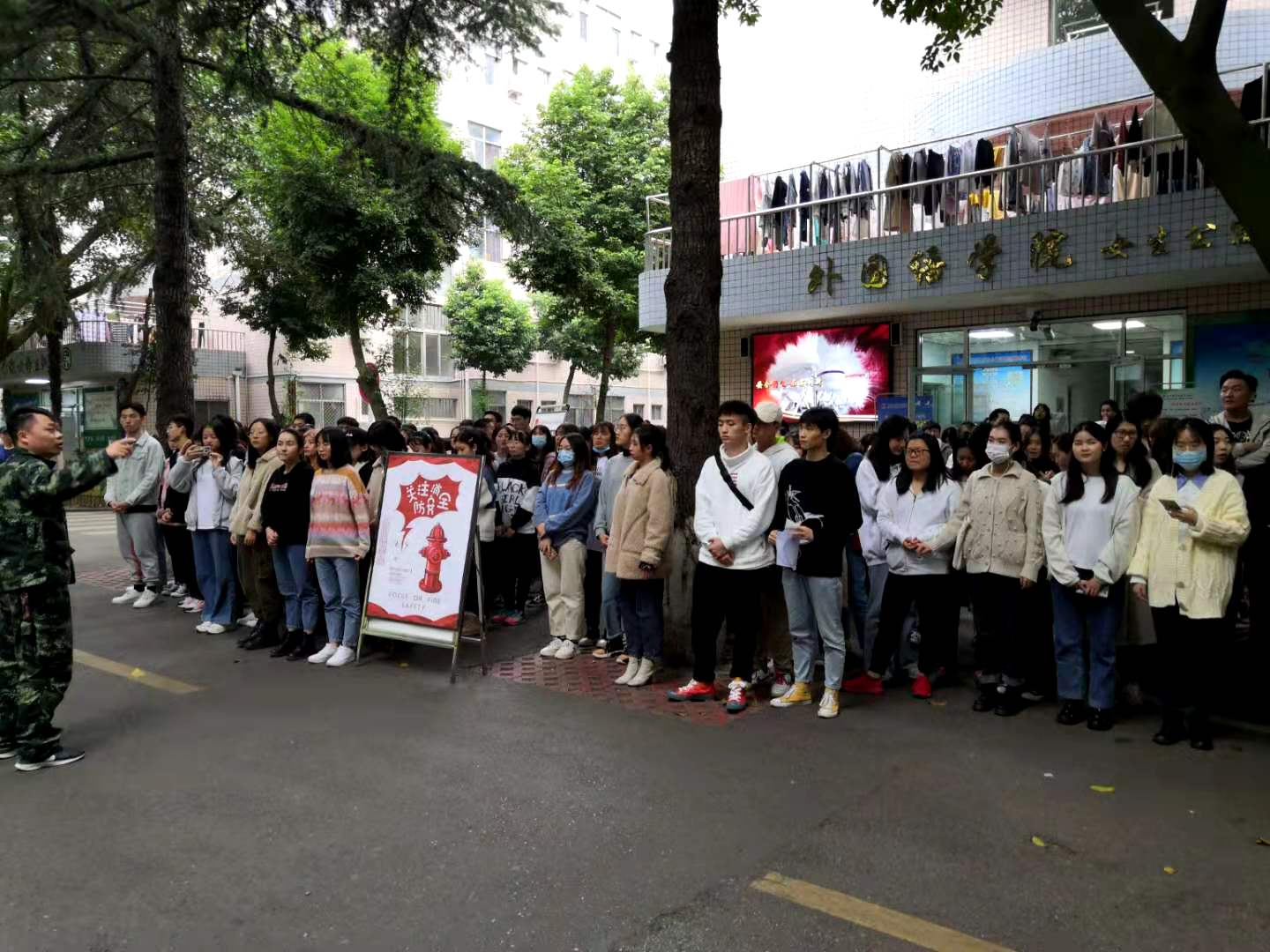 此次消防演练意在加强全院师生在消防安全上的自我救助能力,加强安全教育,提高学生消防安全防范意识。演练第一项为疏散逃生,当警铃响起时,烟雾顿时弥漫宿舍楼道,所有同学闻铃即动,用湿毛巾捂住口鼻,迅速离开宿舍,快速且有序地安全疏散到宿舍楼下空旷区域。