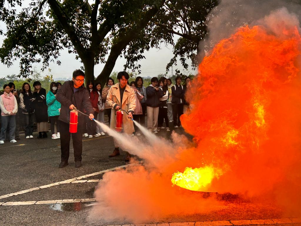 接着,同学们跟随警官来到K栋河边,学习了消防设备、器材使用等基本知识。林警官着重分析了宿舍火灾特征、讲解了干粉灭火器适用的火灾类型、注意事项及使用要点。在进行基本讲解和演示后,警官人工设置了小范围火源点,十二位同学主动申请参与模拟灭火演习。在演习实践中,同学们两两成组,在警官的指导下,严格按照灭火器的基本操作流程,于上风向距离火源三至五米处,拉开消防栓,对准火源根部进行灭火。经过此次模拟灭火演练,同学们不仅熟悉了灭火器的使用方法,同时也提高了自身的消防安全意识及突发事件的应变能力。