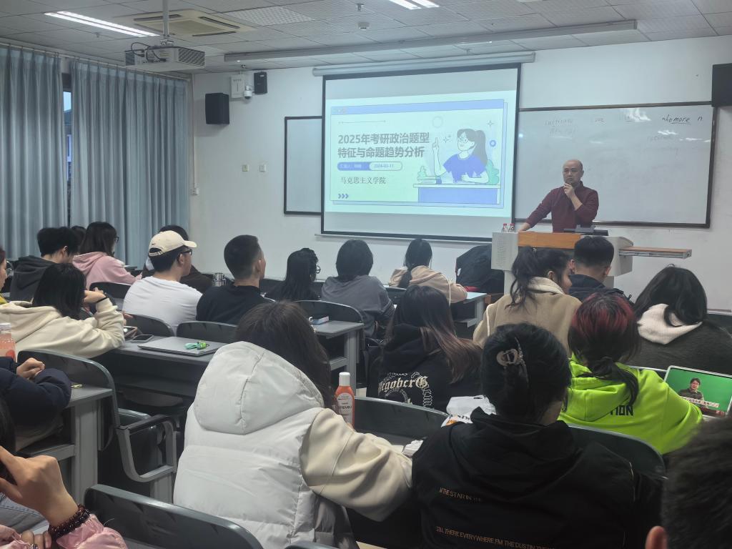 为扎实做好我院学生考研指导工作,帮助学生精准把握考研政治命题特点,taptap点点足彩于3月11日晚7点在5教416举办了主题为“2025年考研政治题型特征与命题分析趋势分析”的讲座。此次讲座由马克思主义学院思想政治教研室主任帅刚副教授主讲,taptap点点足彩团学办副主任叶奇奇主持,2021级辅导员伍家媛与2021级、2022级、2023级学生参与了本次讲座。