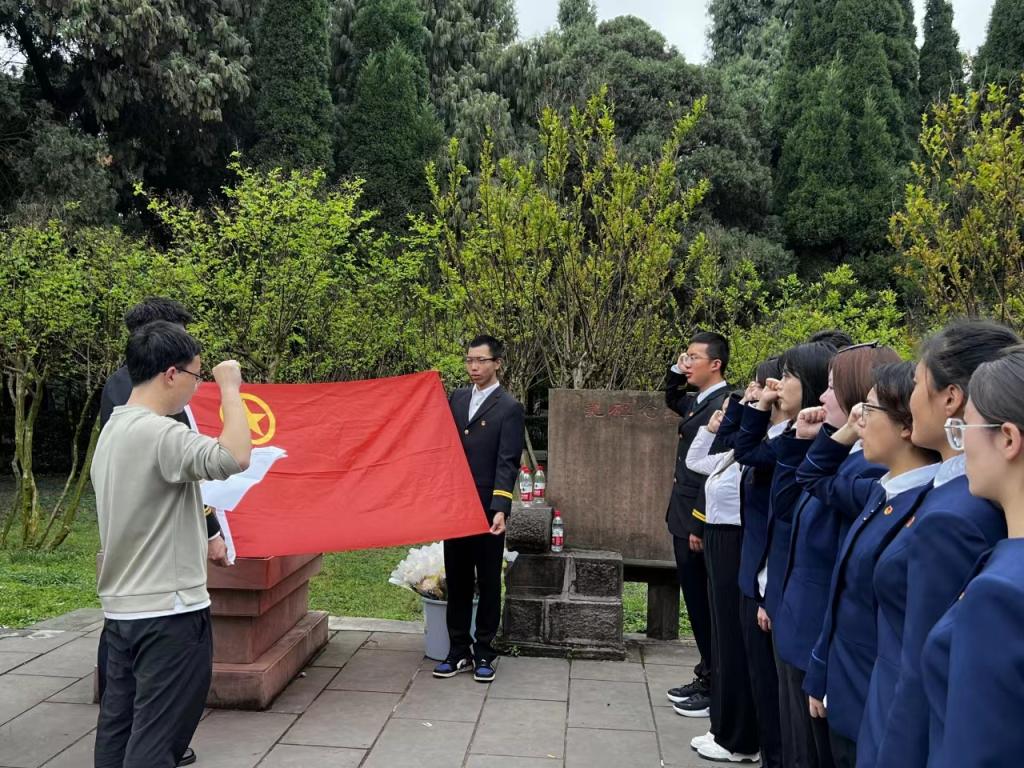 正值清明时分,taptap点点足彩于4月3日在广汉市房湖公园抗战阵亡将士纪念碑前开展了“清明祭祀先烈,红色精神永存”主题教育活动,旨在勉励学生牢记先烈事迹,增强爱国意识。本次活动由团学办叶奇奇副主任主持,学院团学骨干及学生党员参加。本次主题教育活动分为追忆川军历史、佩戴团徽入团宣誓、敬献鲜花表敬意三个环节。